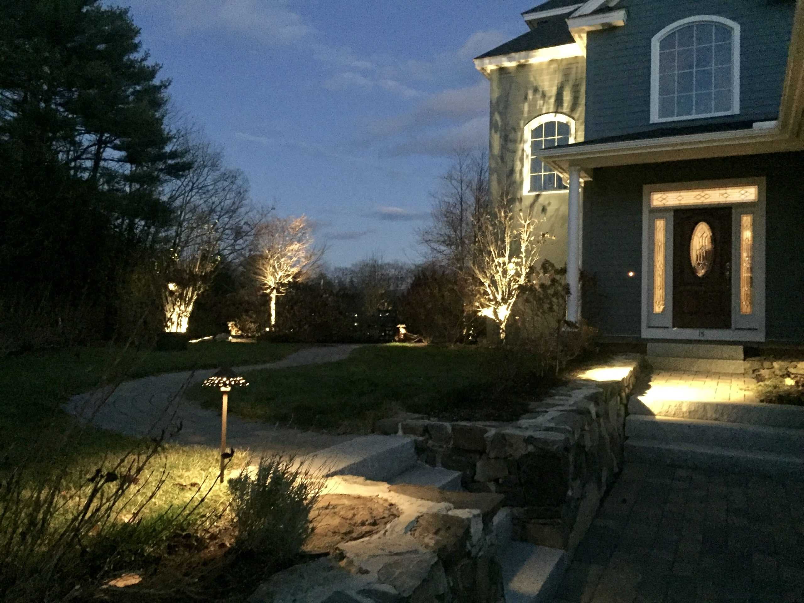 Aesthetics and finances are not the only benefit of landscape lighting, though. Studies have shown that well-lit streets experience less crime. The increased visibility deters would-be burglars, since it is much more likely that they’ll be spotted. It can also leave them wondering if you’re home and awake, reducing their confidence further. Outdoor lighting will improve your personal safety as well, because nicely illuminated paths and sidewalks can prevent stumbling and falling, and you won’t need to shuffle through the dark with the flashlight of your cell phone or have trouble backing down your driveway.